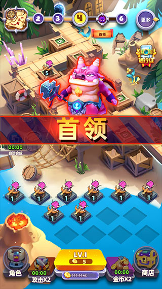 3、当到达一定的关卡,还会出现首领BOSS,需要更高等级的射手才可以击破,下方的格子如果满了,就拖动低等级的士兵到左下角的火山里,就可以让出一个位置便于合成。