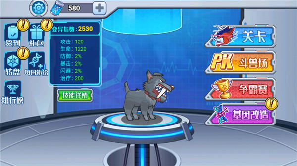 1、下载进入变异狗大战游戏,这里有丰富的关卡、pk斗兽场、争霸赛等模式玩法;