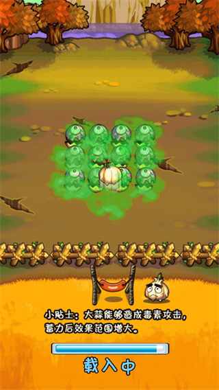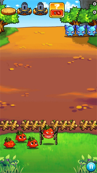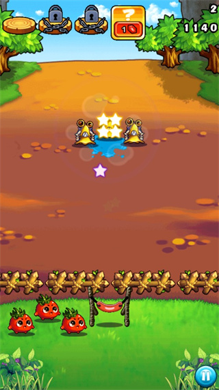 第2关:相比于上一关,怪物战队更加强大,不仅数量增加,攻击范围也相对缩小不少,战队布局依然保持了分散列队,还增加了相当数目的贪吃熊,过关难度着实增加了不少,不过如果能够充分发挥蔬菜们的技能,大蒜 土豆的组合拿到3星的评价还是比较顺利的。