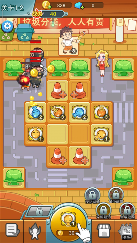 2、你需要不断的升级炮台等级加强炮台攻击力,才能更好的保护你的女神的安全。