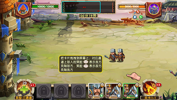 4、把卡片拖拽到屏幕上,对应通道上敌人的哭脸表示我方克制敌方反之则被克。
