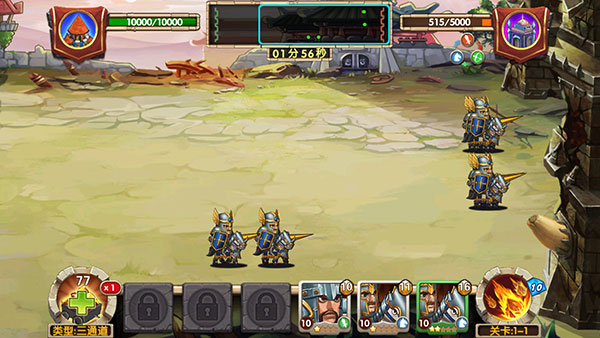 1、游戏和众多塔防对战型游戏都比较类似,战斗中并不会有多么重的操作需求。2、整体操作也非常简单,玩家们只要点击屏幕底部的人物头像来派出士兵即可。