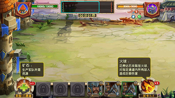 3、关卡界面的两侧分别显示的是招兵所需的矿石资源和消耗钻石的火球法术。