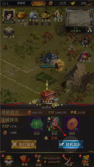 5、在攻城界面中选择挂机加速可以更快的获得资源哦。