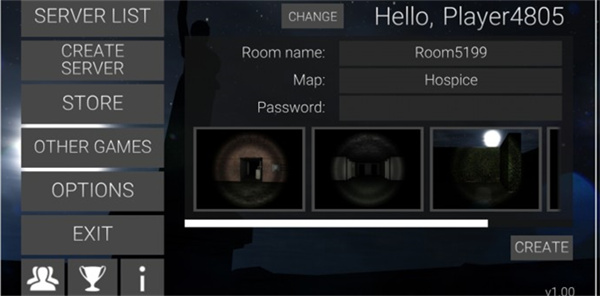 1、首先我们进入瘦长鬼影计划online手游联机版,游戏界面第一个是房间大厅,第二个是创建房间,第三个是道具购买,其他可以不管!