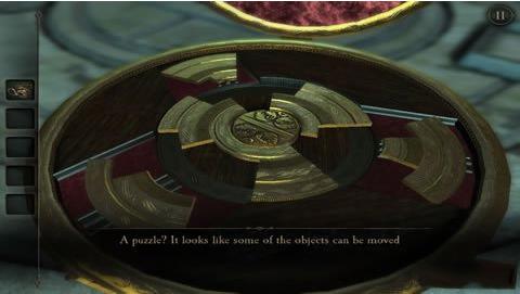 18、将扳手插入右下方的孔里,摇动扳手,圆形的片即将散开,这时候呈现出一个木板,用目镜观察得到一个图纹(类似拼图,跟第二章类似,这里无法给出图片,玩家稍微摸索下即可拼出图形)
