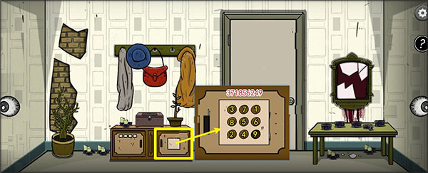 4、打开景中间桌子下右边的柜子,柜子需要按照顺序点击上面的按钮才能打开,打开柜子的密码是371856249,打开柜子得到【美工刀】。