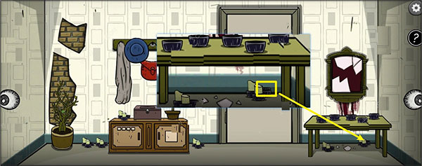 8、用刚刚在时钟场景中得到的【钥匙】打开厨房场景中左侧柜子左下方的小格子,得到【镜片】。同时在场景右侧的管道后拿到【齿轮】,在管道表面拿到【把手】