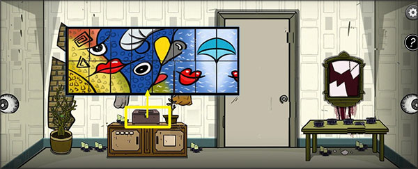 1、注意窗户场景中墙上挂的图画右下角的图案,用刚得到的钥匙打开场景中桌子下方的抽屉,得到【把手】。