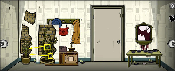 1、在初始场景左下角花盆处拿到【树叶】和【把手】。