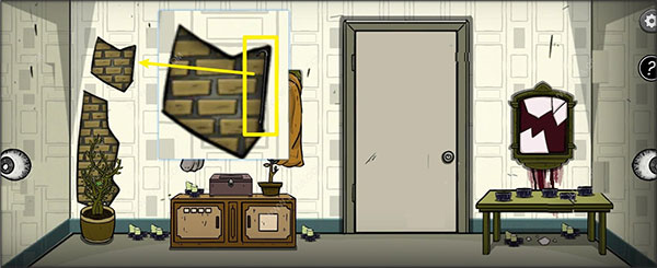 24、左转来到电视机场景,注意电视机场景中所悬挂画右下角的图案,用【胶带】将断开的电线接在一起,按照日记本中的线索提示,将电视机上的按钮旋转至对应位置,电视机屏幕碎开,得到【纸片】。