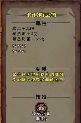 这是一把镰刀,有着独特的普攻链,普通镰刀的普攻比较难受,范围不行硬直巨大,还要强制角色位移,而帕修斯之吻这把镰刀就不一样了,提升了攻击范围而且普攻还带有控制效果,这把武器强制改变角色技能,变成向前旋转突刺,旋转过程有多段伤害还能推怪,最后一击大范围的击飞,在打群怪的时候非常好用。