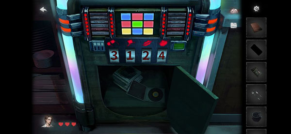 9、根据餐厅四个客人的手势得出,吧台里机器的密码3124,得到唱片。注意机器上的图案(线索3)。