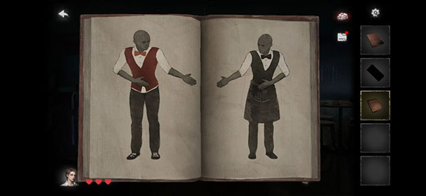 5、吧台上有菜单。每个桌子跑一跑看一看,获得刀叉。让小男孩、吧台男人三个人点好菜(肉汤在另外一桌,假人喝完趴下,手上出现嘴唇印)。