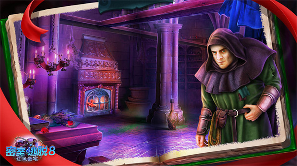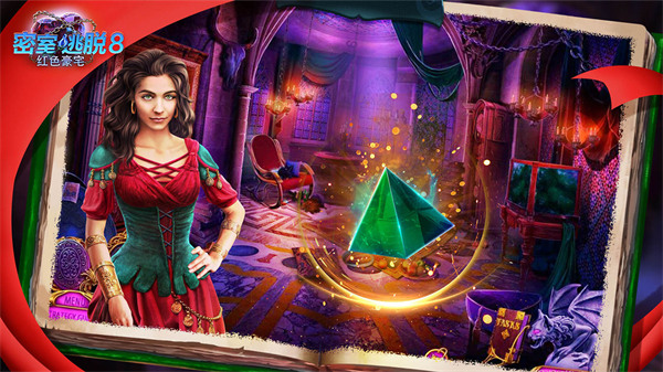8、把彩色圆盘拼在左边墙壁壁画空缺处,调整成壁炉上方一样的图案,拿到钥匙,开门过关!