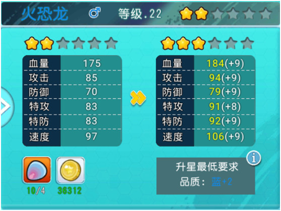 相比较升品,升星所需要的材料就少了很多,只需要提供美丽的鳞片和金币即可完成,而美丽鳞片则需要挑战训练师(精英训练师)和碎片合成获得,训练师还需要完成相应副本挑战获得材料。