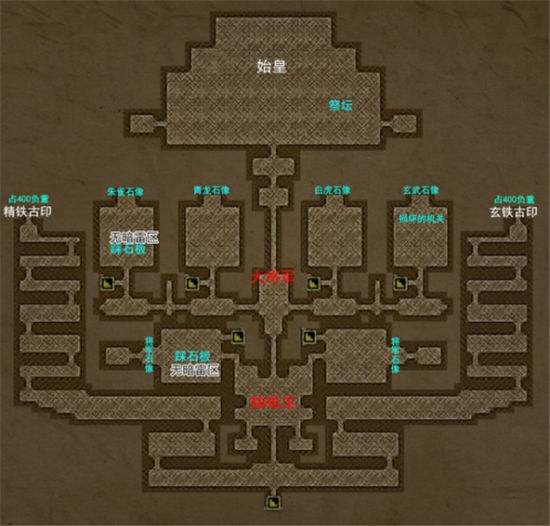 石像房间:包括两个将军石像和四个圣兽石像,都是用来开路的,优先解决这里面的机关。有石板的区域就是无暗雷区,里头的小房间和塌陷神秘区域还是有暗雷。石板还是老规矩踩亮。