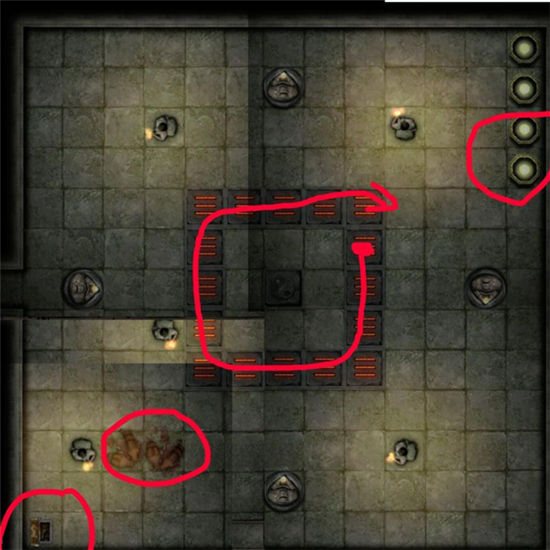 司天盘:这个神秘区域里的机关就是不走回头路,每个按钮只踩到一次。跟图一那个是一样的道理。