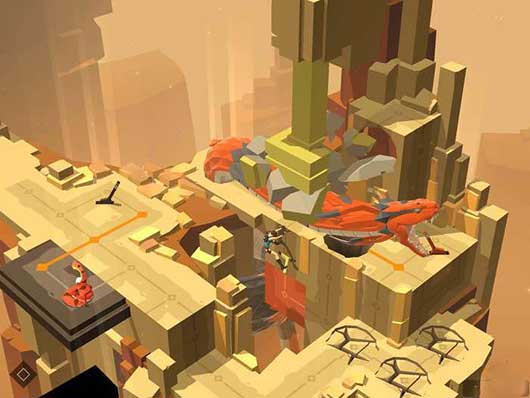 接下来的路程依然需要技巧,我们操纵劳拉从右方的岩壁处进发,注意不要一开始就吸引巨蟒的仇恨。右边绕过去扳动红色机关,下方升降台抬升构成一个墙壁的回路。这个时候我们需要做的是先手爬上高台,紧接着从破碎的墙砖上掉落,这个时候巨蟒会被我们吸引摆出攻击姿态,当我们向下爬的时候巨蟒也会发动攻击。