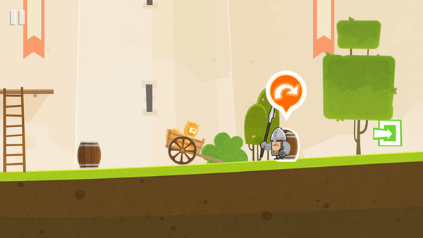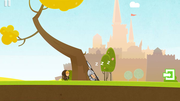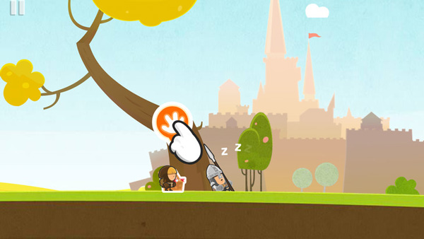 2、第一关咱们是要在一个沉睡的士兵身边拿走果篮,非常简单,操控游戏人物直接是点击屏幕就可以移动,当移动到可以使用动作的物品旁边时,会有相应的动作。
