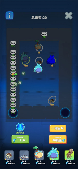 4、当召唤出了同一个星级的卡牌时,即可拖动它们进行合成。点击下方的卡牌还可以进行等级升级。