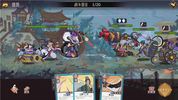 4、卡牌大致分为两种,一种是对己方使用的增益卡牌,一种是对敌方使用的攻击卡牌。每次使用都会消耗行动力,行动力不足时则无法使用卡牌。