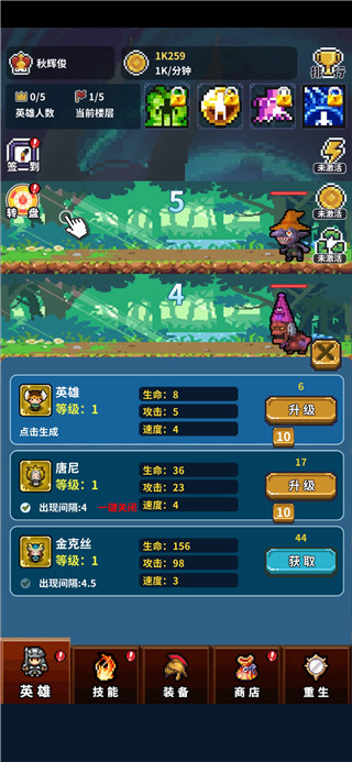 2、点击英雄板块可以为自己的队伍加入新的角色,也可以在这里为他们提升等级。