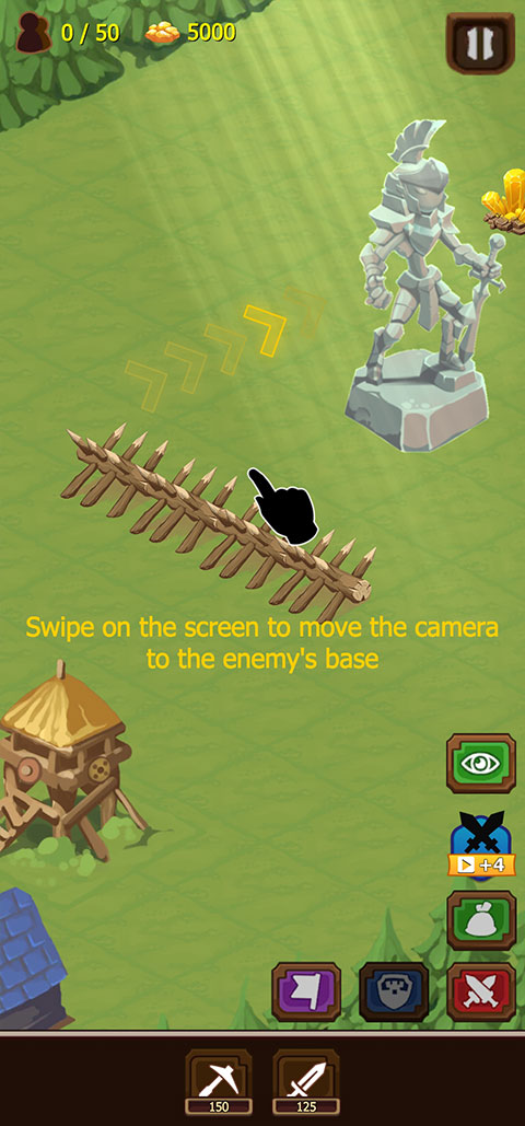 随着矿产资源的疯狂补给,点击底部可以训练士兵,兵种在之后可以逐一添加,训练完成后点击“刀剑”图标,开始进攻,目标摧毁对方雕像!