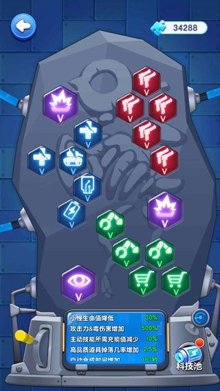 蓝色类做出两套,一套是减少小兵生命值的,一套是减少boss生命值的,这里需要讲的是出兵了就锁定了你科技数值,比如第四关出了兵后,那么可以换成减少boss的科技。到了第5关出boss那么可以切换成小兵科技。有人说这可太麻烦了,那么这里就需要你经常挂机获取金币,来保持炮塔等级的领先,那么你就可以固定带三个五级小兵,两个五级boss,这样技能闪电鸡或者轰炸鸡可以随时留待使用。