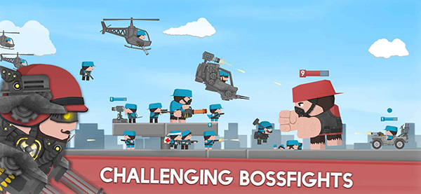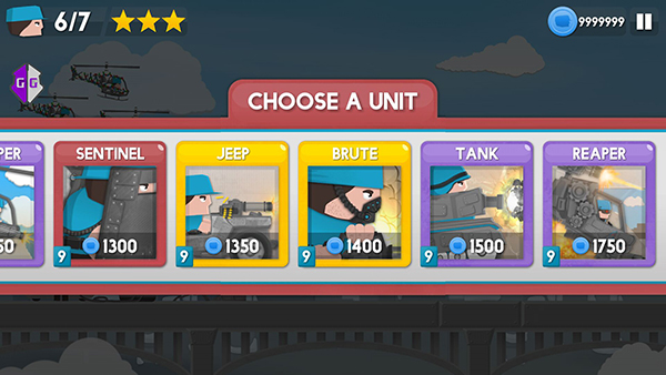 价格750,对于前期来说价格偏贵,但是一定值得买。因为这个兵种无敌注意!无敌。你没看错,特别是玩endless mode模式时,时限完全不是问题,基本是你想玩多久就玩多久。那么,为什么他无敌呢?很简单,可以飞到天上屏幕最顶端,而敌方的空中兵种却也打不到你,也没有地对空导弹什么的。当你飞至屏幕上方,把敌人放在屏幕右侧,这会是手雷兵手雷抛物线的着地点,对付射程较远的步枪兵和RPG兵是,只需在屏幕中央适当地左右移动就可避免子弹/导弹。打死敌人只是时间问题,所以不建议在普通任务关卡中有时限的关卡使用此兵种,而在同样有时限的endless关卡却可以使用,并且游刃有余。因为endless关卡可以跳过一些难以对付又打不到你的兵种。所以手雷兵是赚钱利器,一局endless关卡,少则100金币,多则300+金币。当然,有了这款“克隆军团破解版无限金币无限蓝金币”,通关也是简简单单的。