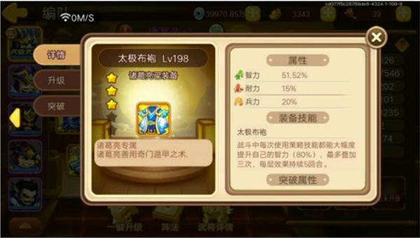 建议给诸葛亮搭配七星全套,并且全部加智力宝石。这样诸葛亮有机率连放两次大水的话,第二次大水伤害几乎翻一倍。在法系武将当中,诸葛亮的输出能力是很不错的。