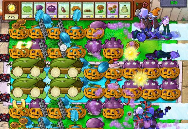 种3排花,并且把河里的六个都升级成双花。在3排花种满之前,出来的僵尸一律用土豆雷炸死。2个土豆雷的回复速度应该是够的,带上一个窝瓜以防万一。3排花种满以后,种2排西瓜,一排南瓜,然后前面放几个地刺。对付水里的铁桶僵尸,用水草把它干掉。