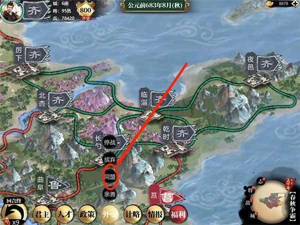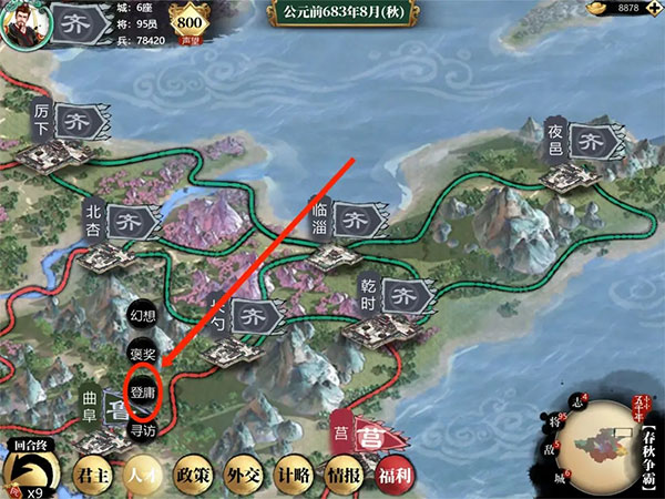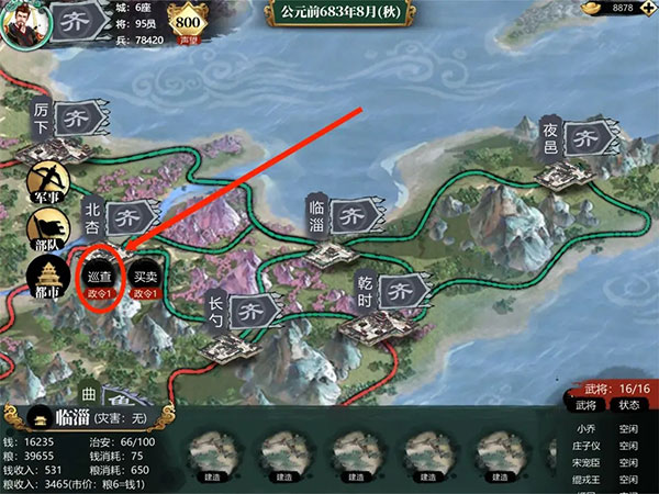 出征需要5点政令,而且战斗过程时间较长。速通玩法应完全放弃战斗,利用巡查、结盟和登庸武将来积累声望。