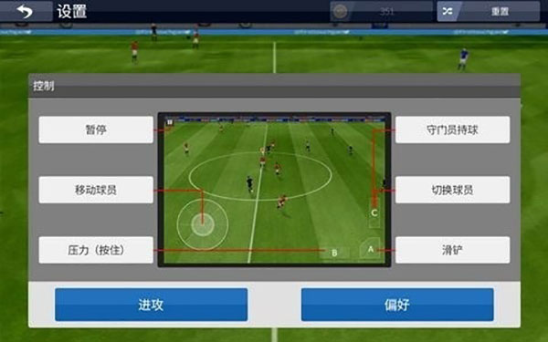 4、在训练场中玩家可以选择自由训练也可以选择训练角球、任意球等定位球战术,对于第一次进入游戏的玩家来说训练场是一个不错的熟悉游戏操作的地方,玩家在左下角的时候拖动虚拟摇杆可以控制球员的移动,而右侧的A、B、C三个按键根据进攻和防守状态下都有不同的功能,玩家可以在控制界面中查看到相应按键的功能。