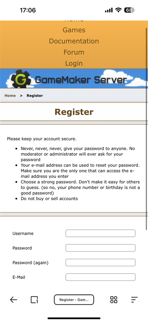 3、根据紫色方框中给的网址在浏览器上输入一下地址:gamemakerserver.com/en/register。