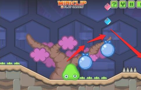 控制粘液跳到气球上,然后跳过钉刺,下面是没有办法通过的!