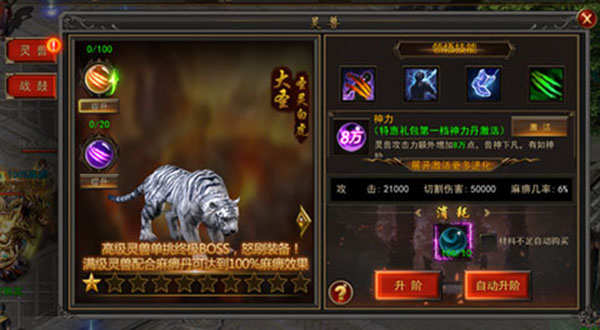 1、灵兽带有多个技能,每一个技能都是boss的克星,技能越多,等级越高,对抗boss时占尽的优势越大。