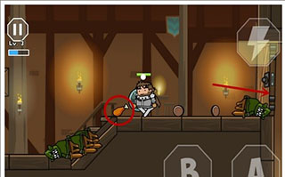 1、战前准备红色箭头所指的门后面就是和BOSS战斗的地方啦,在这之前会从敌人身上掉落鸡腿,如图红色圆圈内所示。吃掉鸡腿就能补满生命值,玩家一定要在战斗前做好准备。