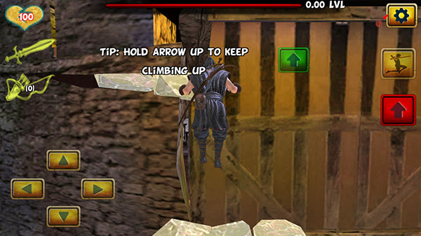 2、左下角按钮控制武士自由移动,右侧屏幕滑动可以旋转视角,调整方向,左侧分别是生命值初始100、刀、以及弓箭,箭需要在场地内自由拾取,初始为0。