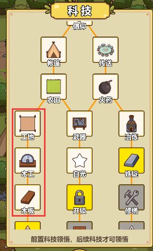 11、生产建筑、生产,先学习科技场地,木工桌、木板。再与围墙里面的荒地交互,建造之后变成基座。与基座交互打开建造生产建筑界面,具体流程看下图例。