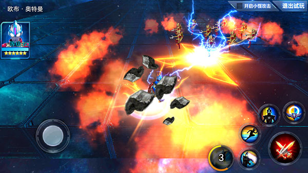 欧布奥特曼跳跃至空中聚焦能量,然后在地面生成高压电场,眩晕范围内的所有敌人,是欧布煌闪形态的终极必杀绝技。