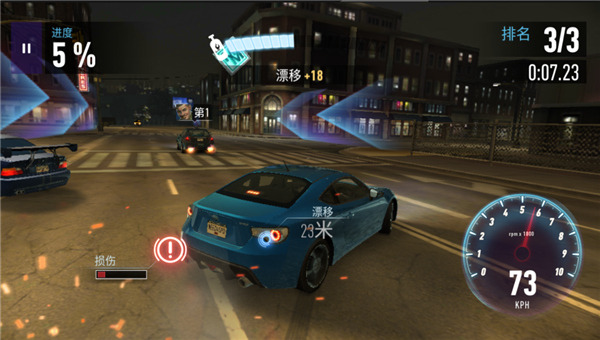 5、手指下滑就是进入漂移模式,需要注意的是下滑之后安装左右来控制赛车的漂移方向,偏移可获得氮气能量;