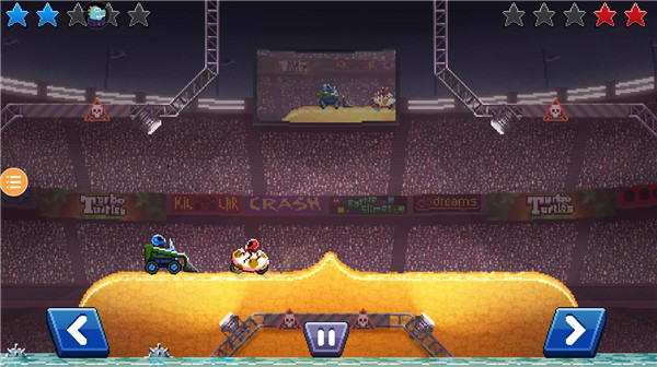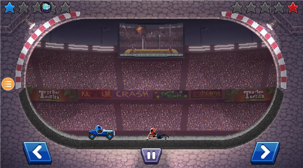 撞头赛车旧版本是一款像素风格的休闲赛车游戏,在游戏中玩家要驾驶各种载具与对手对抗,不管你是直接用赛车撞击对方还是用场地的机关道具攻击对方,只要系统判定一方的头部受伤,游戏就分出胜负了,玩法虽然看上去虽然简单粗暴,但是却充满了乐趣和挑战。一方面,游戏中,有数百种不同的载具可供选择,从普通的汽车、摩托车、自行车等,到奇特的坦克、飞碟、恐龙等,每种载具都有自己独特的外形和性能,玩家可以通过完成任务或者使用金币和螺丝来解锁更多的载具,同时游戏还提供了各种头盔和服装来装扮自己的角色,增加了游戏的趣味性。