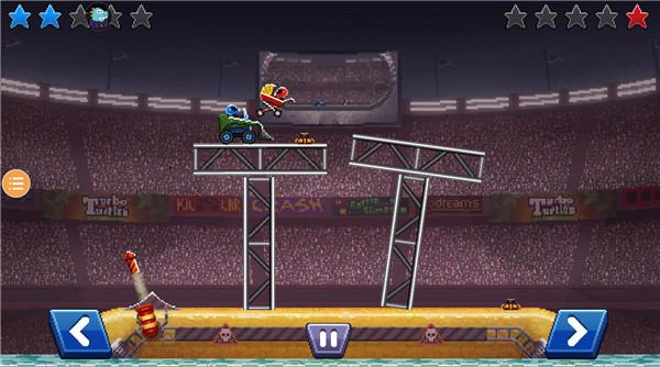 4、像这样在高塔上的场景,玩家需要先稳住赛车不要掉落下来,再去找机会撞击对方,一掉掉落那肯定赛车会解体,从而丢掉积分