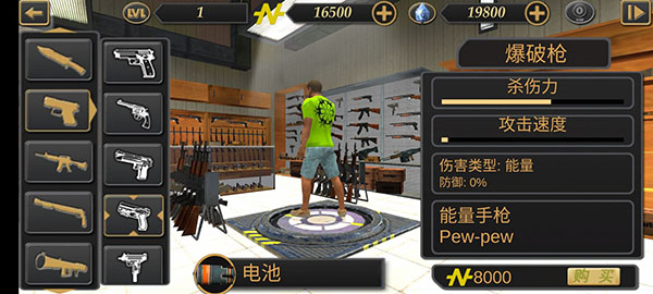价格:8000金币,伤害类型:能量;使用电池,杀伤力中上,攻击速度极慢;由能量手枪Pew-pew。