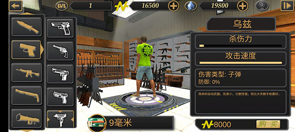 价格:8000金币,伤害类型:子弹;使用9毫米子弹,杀伤力极低,攻击速度极快;简单的自动武器,伤害小,分散性强,但比大多数手枪都好。