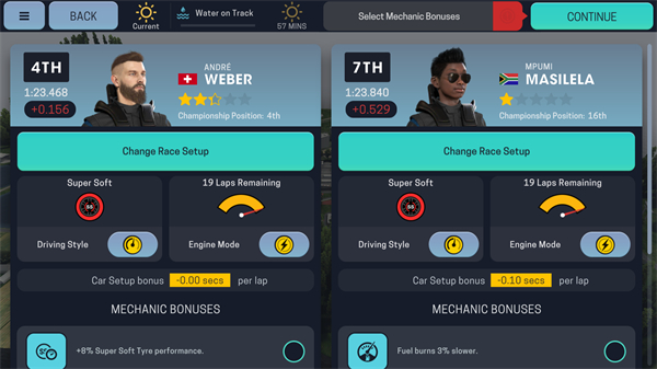 车手是另一个非常重要的变量,并且可经营度不亚于车辆。玩家作为经理,要能根据车手的期望提供双方认可的合约。签下之后,车手的表现也会为他自己挣下技能点升级,一共六项指标,都是越高越好。