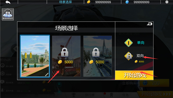7、点击开始游戏选择场景,也可以通过金币解锁其他的场景,还支持单向、双向;