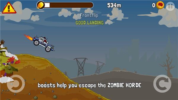 游戏操作较为简单,玩家点击屏幕即可射击前方的僵尸,车撞到前方的僵尸会减速。当然,操作如果仅此而已未免显得有些枯燥。游戏过程中,玩家可以在屏幕底部看见两个按键。点击左右两个功能按键来控制汽车平衡,汽车翻身落地后游戏失败。在游戏过程中发现一个小技巧,不管是爆头击杀僵尸、压碎僵尸还是使用特技翻转汽车后完美落地后还可以得到加速效果。