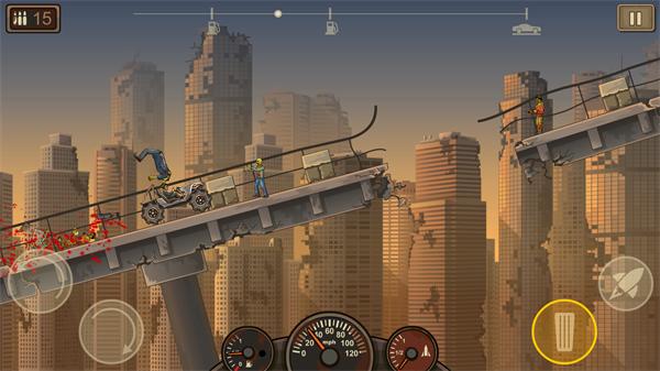 1、巧妙的融合不同的元素,驾驶车辆在大荒原上闯关,极速的前进避开僵尸的袭击。